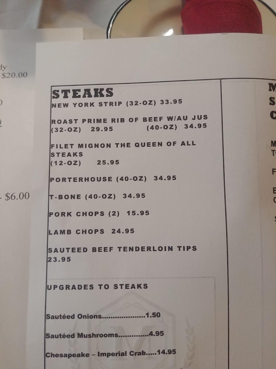 “ Thursday night steak special can’t be beat. 45 for 40 oz porterhouse, t-bone or prime rib plus two sides. Porterhouse was very well seasoned and cooked medium well as requested. Seafood platter was also good. Fried scallops and flounder were especially good. Service was excellent. Very old school atmosphere…very local feel in a good way. Would definitely go back. ”